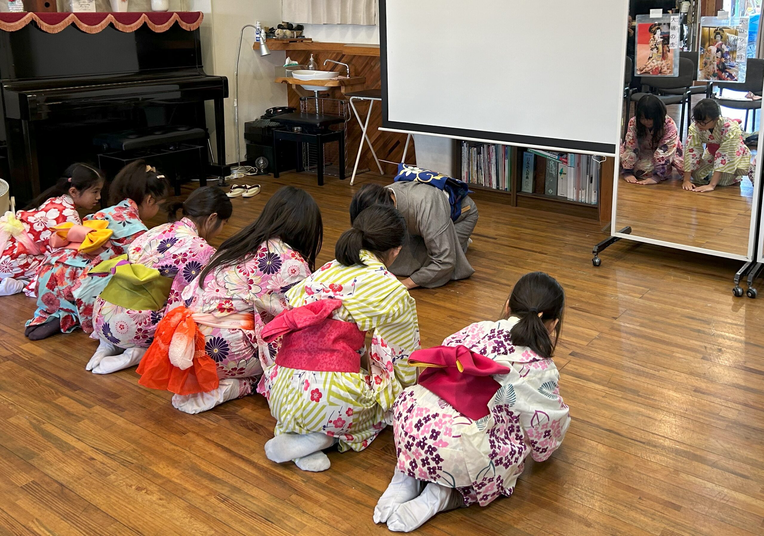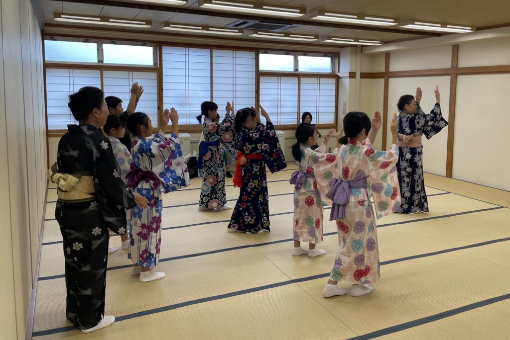 「子ども民踊教室」は、経験豊富な教授陣の指導を受けた次世代の指導者達が、初めて民踊に触れる子供達を指導育成することを通じて、無形文化財である民踊を未来へと継承しています。着物の着付けから扇子の扱い方まで丁寧に指導します。