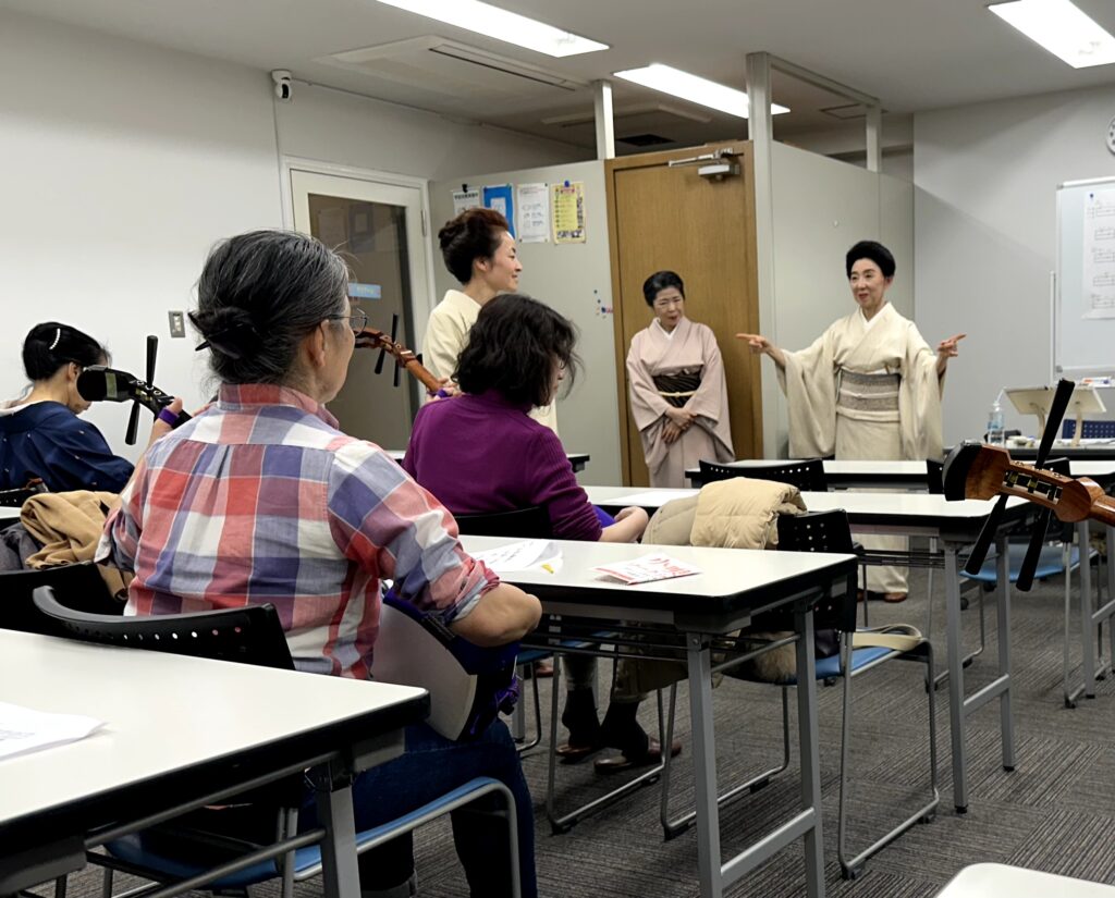 「日本小唄連盟」では、江戸の粋を代表する芸能である小唄を若い世代に伝えるため、定期的にワークショップを開催しています。平日の夜、勤め帰りの人が立ち寄りやすいよう駅から近い会場で開催し、小唄の技芸に触れてもらうことを目的に丁寧な指導とプロによる実演をします。
